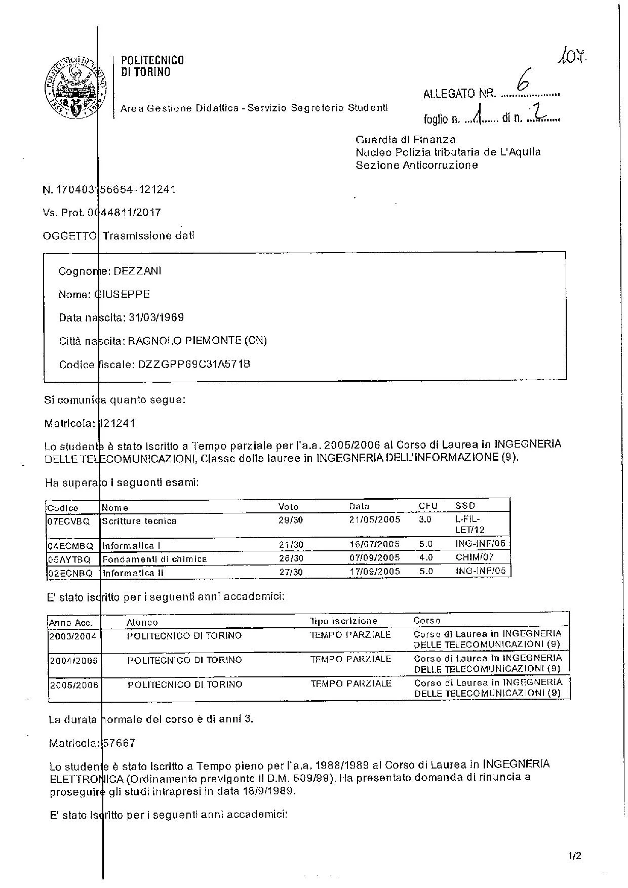 . In basso il falso curriculum di Giuseppe Dezzani e le indagini della Guardia di Finanza su Giuseppe Dezzani.