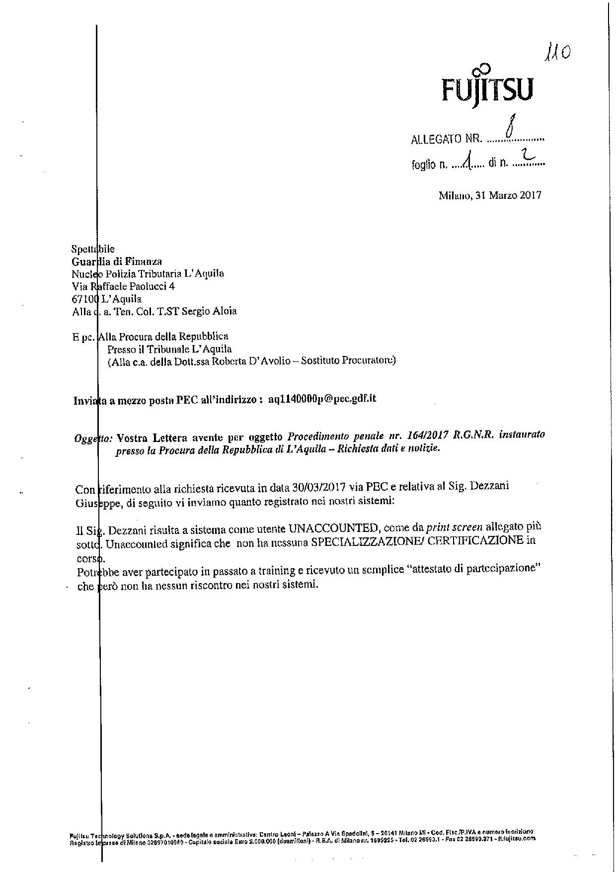 Nel frattempo i due pm pesaresi incaricano come consulente informatico Giuseppe Dezzani, per la consulenza sui dispositivi elettronici del medico. Dezzani si fa chiamare dottore giura di essere laureato in informatica e dottore, Ma le investigazioni dei criminologi e la Guardia di Finanza di L’Aquila portano alla luce come il consulente delle Procure, Giuseppe Dezzani, sia un millantatore e truffatore, che ha falsificato atti, non laureato che non ha neanche frequentato corsi a pagamento ma che ha venduto solo computer.